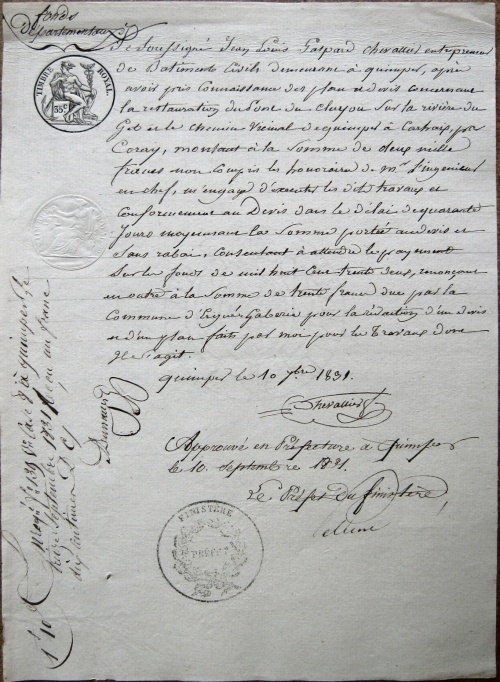 23 août 1831. Chemin vicinal de Quimper à Carhaix. Pont du Cluyou. Réparation urgente. Joindre les pièces. Exped.