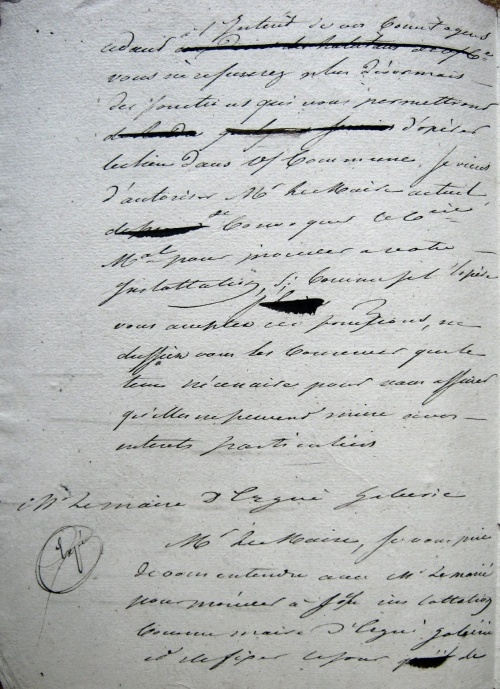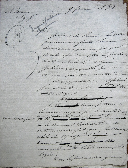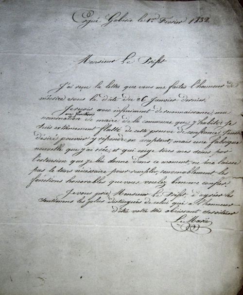 Je reçois avec infiniment de reconnaissance, ma nomination aux fonctions de maire de la commune que j'habite. Je suis extrêmement flatté de cette preuve de confiance. J'eusse désiré pouvoir y répondre en acceptant ; mais une fabrique nouvelle que j'ai cré(é)e, et qui exige tous mes soins, par l'extension que je lui donne dans ce moment, ne me laisse pas le tem(p)s nécessaire pour remplir convenablement les fonctions honorables que vous voulez bien me confier.