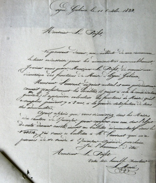 Ne pouvant donner aux intérêts de ma commune le tem(p)s nécessaire pour les administrer convenablement, je viens vous prier, Monsieur le Préfet, de recevoir ma démissions des fonctions de Maire d'Ergué-Gabéric.