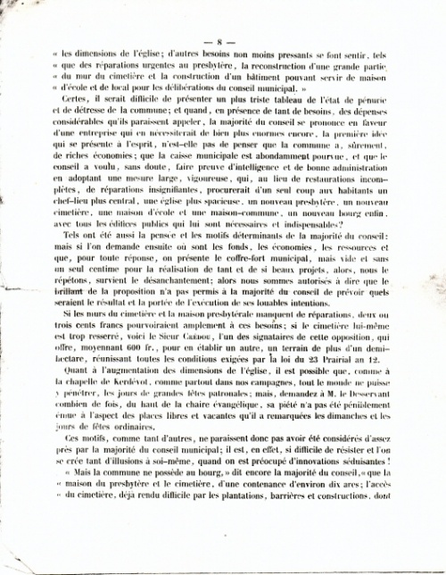 les dimensions de l'église ; d'autres besoins non moins pressants se font sentir, tels que des réparations urgentes au presbytère, la reconstruction d'une grande partie du mur du cimetière et la construction d'un bâtiment pouvant servir de maison d'école et de local pour les délibérations du conseil municipal ».