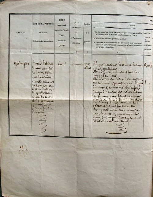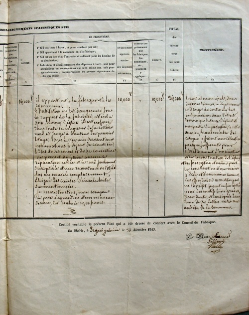 - Colonne 6 : 1° si elle en bon état d'entretien (indiquer autant que possible si l'édifice offre de l'intérêt sous le rapport de l'art ; 2° Si elle est suffisante pour la population ; 3° Indication et détail sommaire des dépenses à faire pour acquisitions et pour travaux de construction, d'agrandissement ou de grosses réparations.