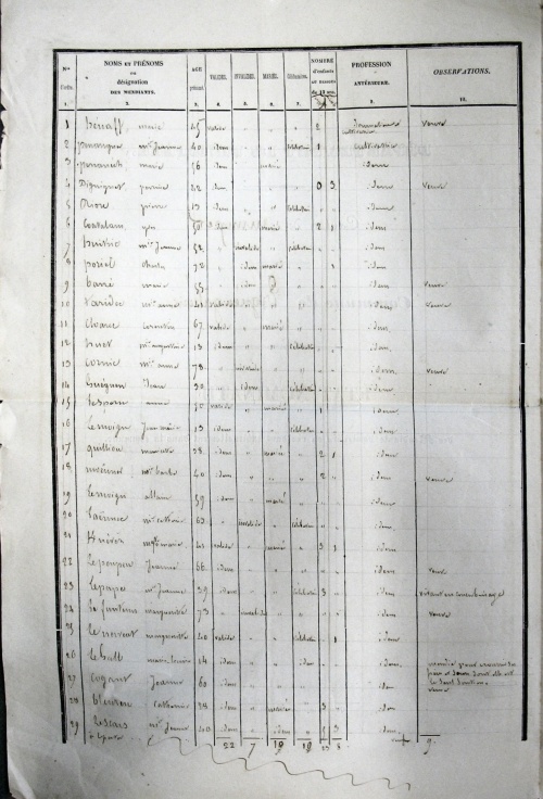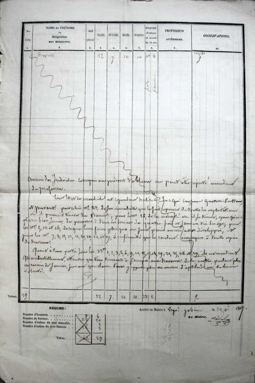 Document daté du 20 décembre 1847 En terme de statistiques, on peut noter sur ce recensement où sont identifiés les 29 mendiants "adultes" de la commune (avec mention de l'âge, état marital, invalidité, et enfants éventuels de moins de 12 ans) :