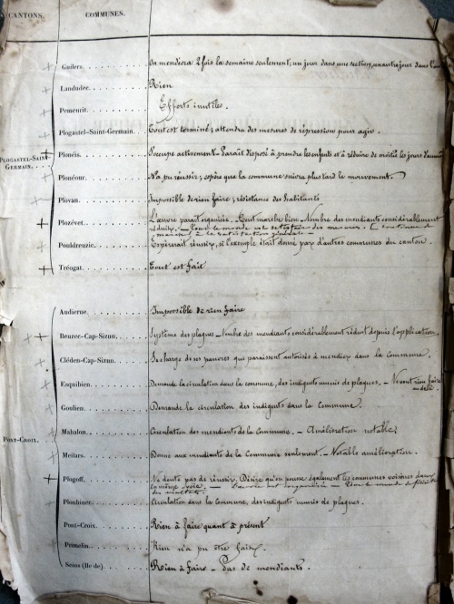 Aujourd'hui que l'assistance est organisée dans votre commune, il faut songer à organiser la répression. Je vous engage donc à prendre immédiatement un arrêté pour interdire la mendicité à Ergué-Gabéric. Vous voudrez bien me faire parvenir plusieurs copies de cet arrêté, et je les transmettrai aux Maires des communes voisines avec mes recommandations particulières.