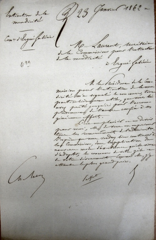 Déjà j'ai eu l'honneur de vous informer par mes lettres du 17 mars 1858 et celle du 1er août 1859 du bon résultat de nos premières démarches pour l'extinction de la mendicité.
