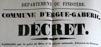 Cette reconduction des droits d'octroi, ou plus précisément du droit d'entrée sur les boissons, vaut pour 10 ans, c'est-à-dire jusqu'au 31 décembre 1876. A noter que les droits d'octroi seront abandonnés sur le territoire de la commune d'Ergué-Gabéric en 1921. Une dizaine d'années plus tôt, en 1857, le tarif de l'octroi fit l'objet d'un placard à afficher dans les lieux publics : « 1857 - Une affiche impériale pour l'arrêté du règlement et tarif de l'octroi » ¤ |