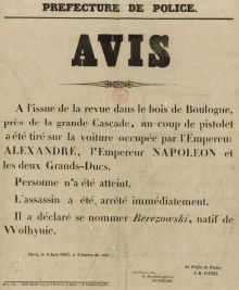 L'importance politique du soutien du conseil municipal à l'Empereur est telle que la lettre est publiée dans le registre de ses délibérations. Cette adresse collective s'adresse personnellement à Napoléon III qui est 3 fois apostrophé par le titre de « Sire ! », et par ailleurs par les termes « l'élu de la nation française » et « l'Empereur des Français ». Le texte démarre pompeusement par cette phrase : « La divine providence qui veille sur tout a encore voulu dans ces derniers jours montrer sa puissance en Vous sauvant si miraculeusement ». Cette providence, une fois de plus, « a prouvé au monde entier que l'élu de la nation française est bien celui qu'elle a choisi et entre les mains duquel elle désirait mettre les destinées de la france ». La salutation finale de la lettre est : « Vive l'Empereur ! Vive l'Impératrice ! Vive le Prince Impérial Alexandre II est en visite en France, car cette année-là la France accueille une section russe pour la première fois dans une Exposition universelle parisienne. Le Tsar est invité par Napoléon III à visiter l’Exposition universelle de Paris, avec également l'objectif de renouer une alliance entre les deux États. Mais l'attentat au bois de Boulogne va faire capoter les discussions de rapprochements. Ceci malgré le fait que l'assassin ne fut pas chanceux avec son pistolet à deux coups. C'est le cheval qui reçoit la première balle. Le second canon de l’arme lui éclate dans la main, et il est sérieusement blessé à la main droite, il veut crier « vive la Pologne » mais un agent le réduit au silence : on évacue alors le blessé qui échappe de peu à un lynchage par la foule. Dans leur lettre, les gabéricois l'accusent en ces termes : « ces hommes méchants qui n'aspirent qu'au mal, qui veulent tout détruire et qui ne désirent que la guerre civile ». |