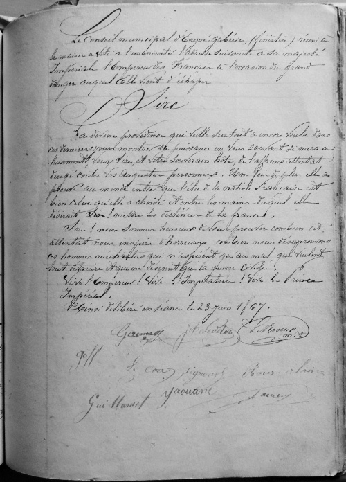 | Une délibération du conseil municipal du 23 juin 1867 incluant l'adresse envoyée à l'Empereur Napoléon III suite à la tentative récente d'attentat à son encontre et celle d'Alexandre II, empereur de Russie en visite en France.