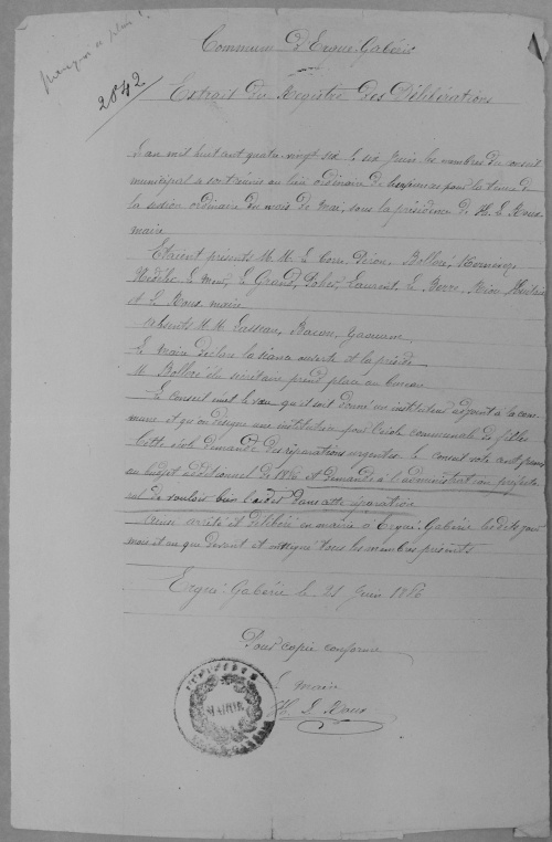 M. le maire entretient le conseil de la question [de l'école] communale des filles et lui soumet le devis présenté par l'architecte départemental. Après avoir délibéré le conseil est d'avis qu'on ne fasse pour cette année que les dépenses strictement nécessaires et prie M. le Préfet à autoriser M. le maire à traiter de gré à gré.