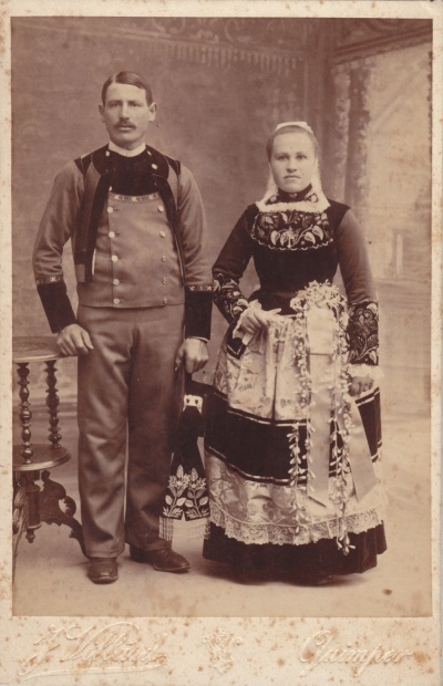 - Joseph Marie Villard (1868-1935), fils du photographe Joseph Villard (1836-1898) qui avait déjà un créé un fonds très important de plaques photographiques (avec des monuments et des sujets pittoresques de Bretagne), épouse Marie Françoise Ferron dont le père était éditeur à Quimper. Ce mariage de la photographie avec l'édition en fait un photographe éditeur, rue Saint François à Quimper. Photographe des costumes mais aussi des scènes de rue et des paysages, il sera le créateur de la célèbre Collection Villard bien connue des collectionneurs de cartes postales (trois millions de cartes vendues par an). Ami de Théodore Botrel ils travailleront l'un pour l'autre, Villard illustrant ses chansons, Botrel lui écrivant des légendes pour ses clichés. Son fils Joseph-Henri-Marie (1898-1981) prendra sa suite. Son frère Paul, Docteur, aura un fils, Jean Albert, qui sera organiste à Poitiers. [Ref.↑]