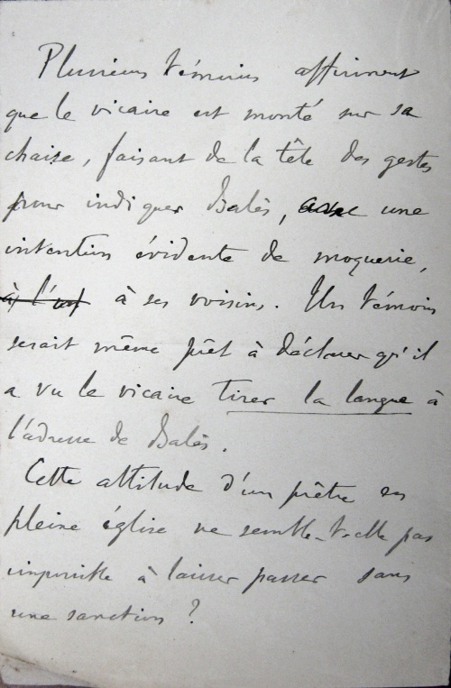 Tout le monde a considéré l'attitude du vicaire comme très injurieuse et j'aurais été à la place de M. Balès je ne crois pas que j'aurais eu sa patience.