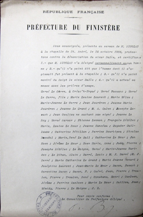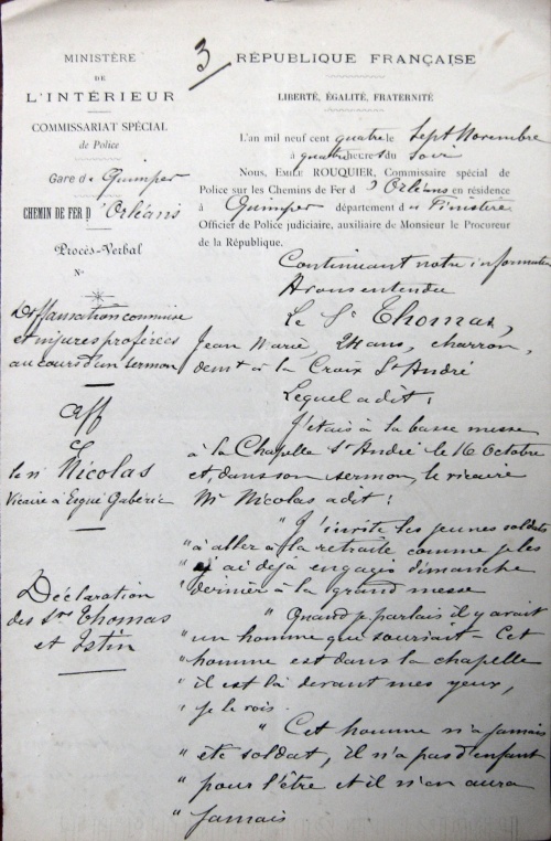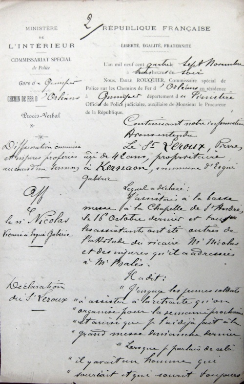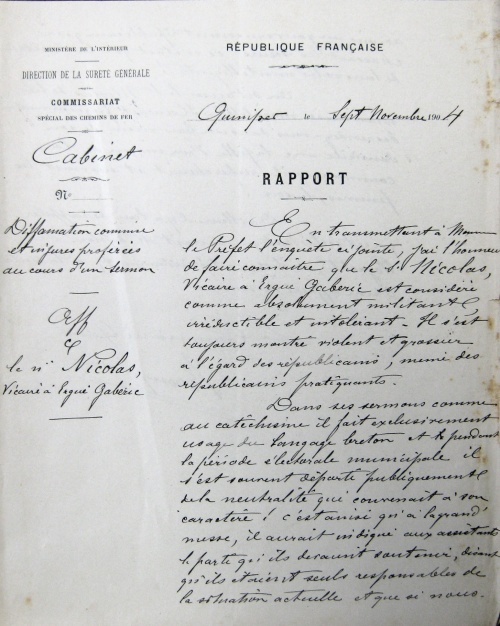 En transmettant à M. le Préfet l'enquête ci-jointe, j'ai l'honneur de faire connaitre que le sieur Nicolas, vicaire à Ergué-Gabéric, est considéré comme absolument militant, irréductible et intolérant. Il s'est toujours montré violent et grossier à l'égard des républicains, même des républicains pratiquants.