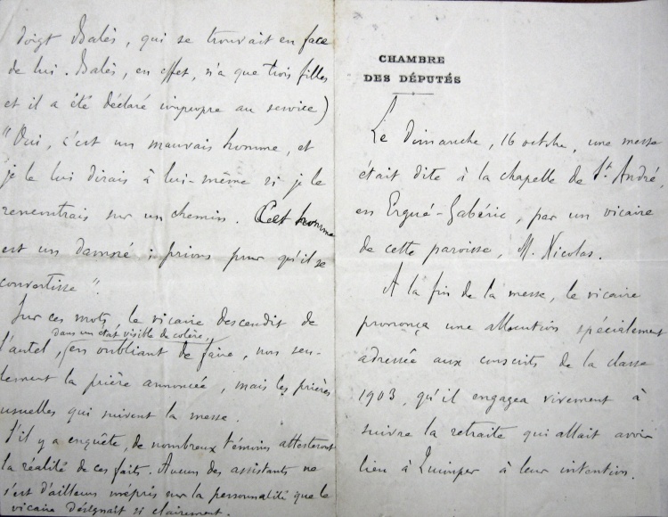 Le 9 octobre j'étais à la grand messe à côté de M. Balès et je puis affirmer qu'il n'a pas souri lorsque le vicaire M. Nicolas a engagé les jeunes soldats à aller à la retraite.