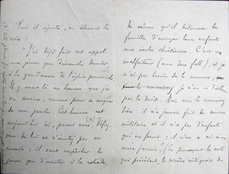 Cette phrasez fut répétée deux ou trois fois avec un geste indicateur. « Défiez-vous de lui et n'écoutez pas ses conseils : il veut empêcher les jeunes gens d'assister à la retraite, de même qu'il détourne les familles d'envoyer les enfants aux écoles chrétiennes. C'est un malfaiteur et je n'ai pas besoin de le nommer ; je n'en ai d'ailleurs pas le droit. Mais vous le connaissez bien : il n'a jamais fait de service militaire et il n'a pas d'enfants qui en feront. Il n'en a ni n'en aura jamais ». En prononçant les mots qui précèdent, le vicaire indiquait du doigt M. Balès qui se trouvait en face de lui. M. Balès, en effet, n'a que trois filles et il a été déclaré impropre au service. « Oui, c'est un mauvais homme, et je le lui dirai à lui-même si je le rencontrais sur un chemin. Cet homme est un damné ; prions pour qu'il se convertisse ».