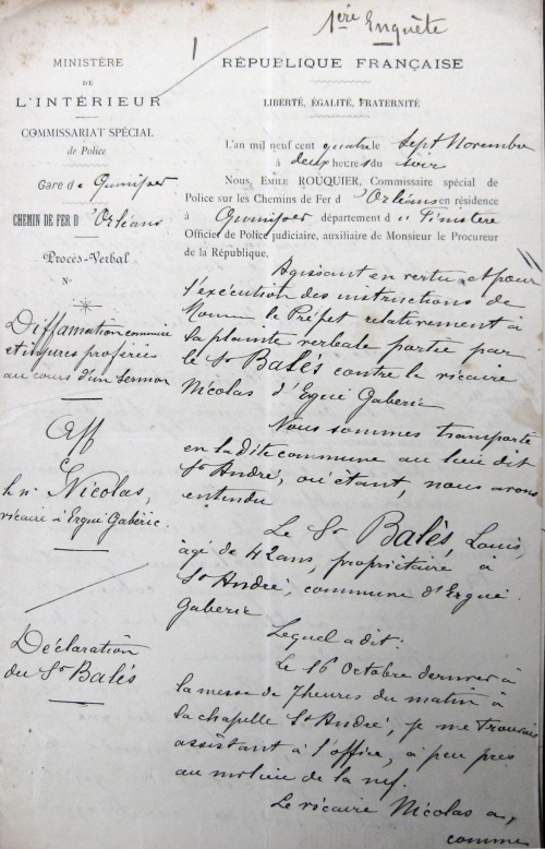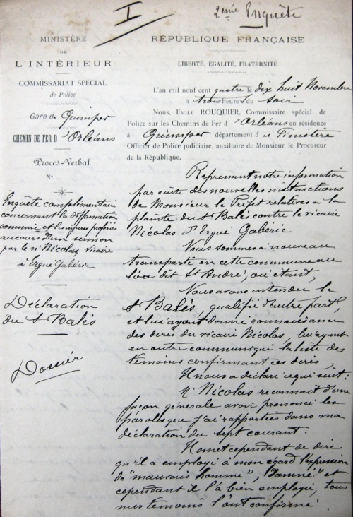 Agissant en vertu et pour l'exécution des instructions de M. le Préfet relativement à la plainte verbale partie par le sieur Balès contre le vicaire Nicolas d'Ergué-Gabéric.