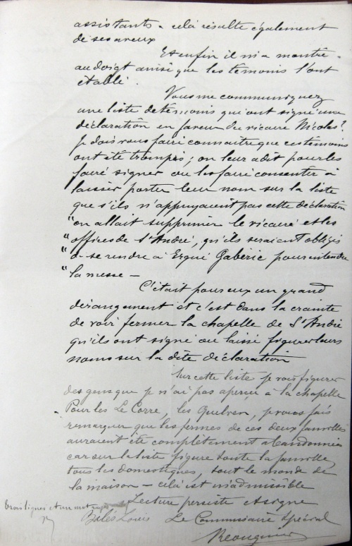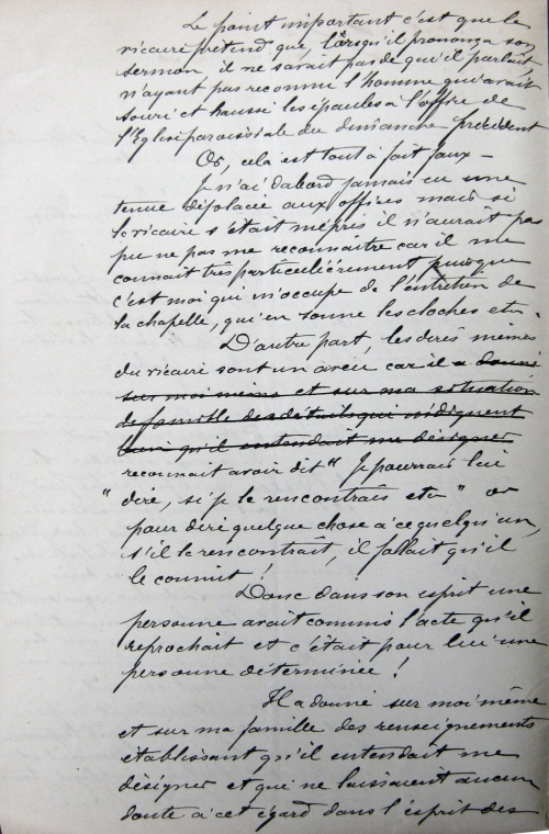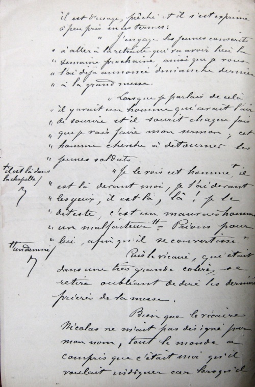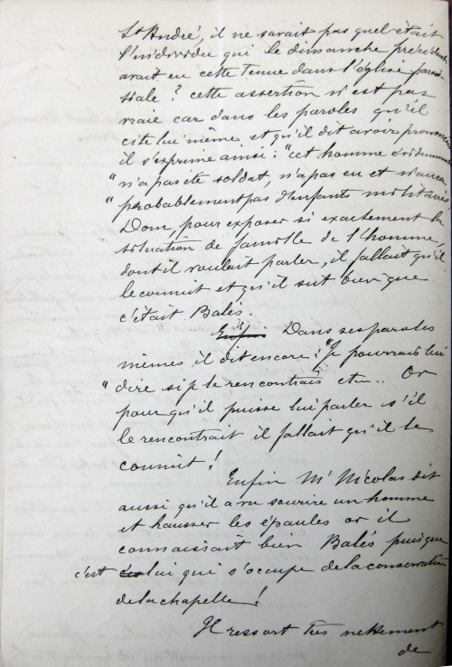 J'assistais à la basse messe à la chapelle de St-André le 16 octobre dernier et tous les assistants ont été outrés de l'attitude du vicaire M. Nicolas et des injures qu'il a adressées à M. Balès. Il a dit :