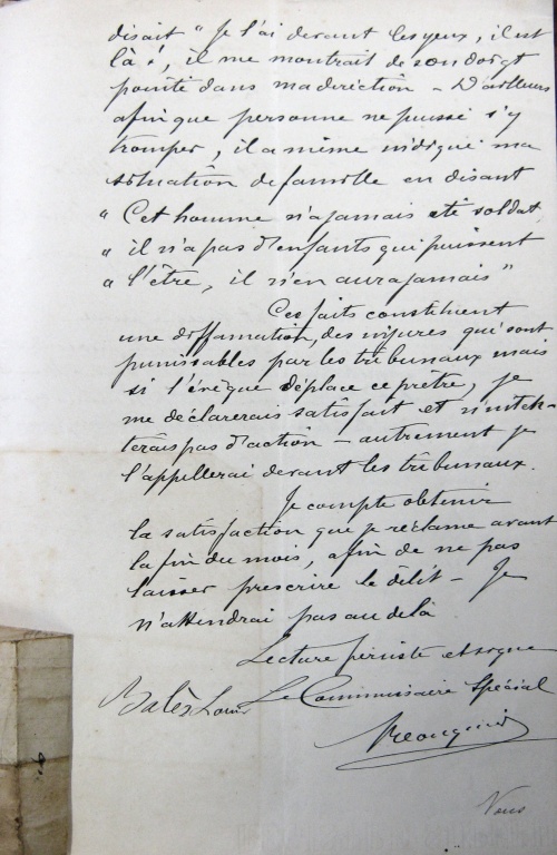 Ces faits constituent une diffamation, des injures qui sont punissables par les tribunaux, mais si l'évêque déplace ce prêtre, je me déclarerais satisfait et n'intenterais pas d'action - autrement je l'appellerai devant les tribunaux.