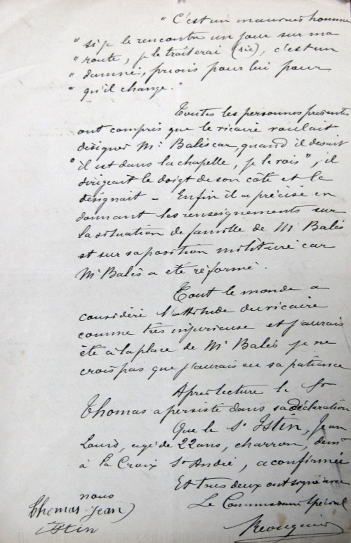 Toutes les personnes présentes ont compris que le vicaire voulait désigner M. Balès, quand il disait : « il est dans la chapelle, je le vois », il dirigeait le doigt de son côté et le désignait. Enfin il a précisé en donnant les renseignements sur la situation de famille de M. Balès et sur sa position militaire car M. Balès a été réformé.