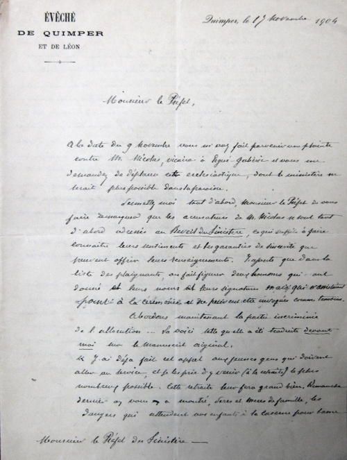 Quimper le 9 novembre 1904. Monsieur l'Evêque.
