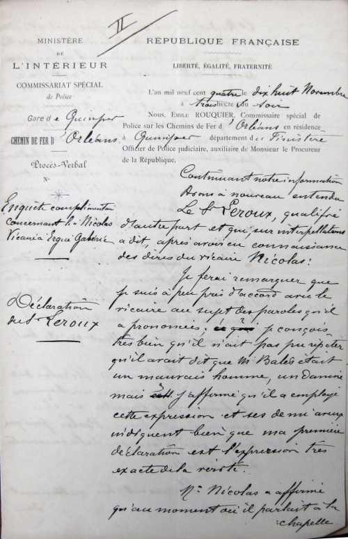L'an mil neuf cent quatre, le sept novembre à trois heures du soir. Nous, Emile Rouquier, commissaire spécial de Police sur les Chemins de Fer d'Orléans en résidence à Quimper département du Finistère Officier de Police judiciaire, auxiliaire de Monsieur le Procureur de la République.