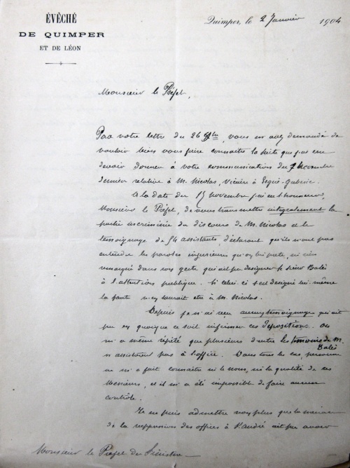Je ne doute pas, monsieur l’Évêque, qu'après un examen sérieux de cette affaire, vous n'arriviez à penser comme moi que M. Nicolas n'est plus en situation d'exercer son ministère à Ergué-Gabéric.