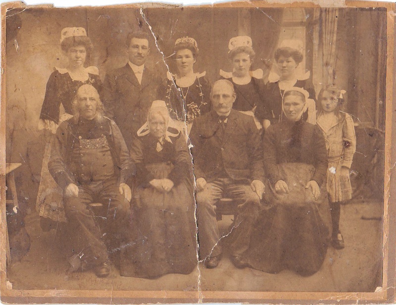 Sur cette photo du 5 septembre 1912, les mariés posent avec leurs parents respectifs, une nièce et trois sœurs de la mariée. Au premier rang, on peut admirer le costume glazig et les longs favoris de Jean-Pierre Rolland, le contremaitre que le patron René Bolloré qualifiait de « vieux loup de papeterie ». La mariée et ses sœurs portent la coiffe de Scaër alors que, plus jeunes sur une autre photo de 1902-1904 (cf « Jean Pierre Rolland (1855-1914), papetier » ¤ ), elles avaient la coiffe "borledenn" d'Odet. Dans le recensement de la population de Scaër en 1906 (page 75), la mariée qui n'a que 19 ans est déclarée comme « compteuse papetière », à savoir employée comptable à l'usine de Cascadec où travaillait son père. |