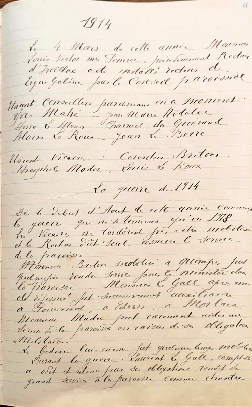 Monsieur Breton mobilisé à Quimper put quelquefois rendre service pour le ministère dans la paroisse. Monsieur Le Gall après avoir été réformé fut successivement auxiliaire à Fouesnant, à Edern, à Morlaix. Monsieur Madec put rarement aider au service de la paroisse en raison de ses obligations militaires. Le bedeau lui-même fut quelque temps mobilisé.