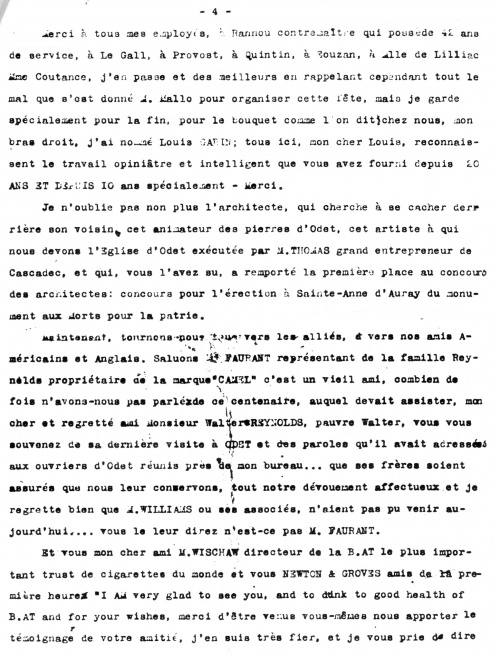 Maintenant, tournons-nous tous vers les alliés, vers nos amis Américains et Anglais. Saluons Le Faurant représentant de la famille Reynolds propriétaire de la marque "Camel", c'est un vieil ami, combien de fois n'avons-nous pas parlé de ce centenaire, auquel devait assister, mon cher et regretté Monsier Walter Reynolds, pauvre Walter, vous vous souvenez de sa dernière visite à Odet et des paroles qu'il avait adressées aux ouvriers d'Odet réunis près de mon bureau ... que ses frères soient assurés que nous leur conservons, tout notre dévouement affectueux et je regrette bien que M. Williams ou ses associés, n'aient pas pu venir aujourd'hui ... vous le leur direz n'est-ce pas M. Faurant.