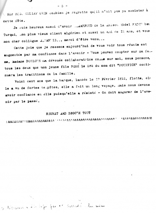 Cette joie que je ressens aujourd'hui de vous voir tous réunis est augmentée par ma confiance dans l'avenir. Vous pouvez compter sur ma femme, Madame Bolloré, ma dévouée collaboratrice, comme sur moi, nous pensons tous les deux que mon jeune fils René, le 2e du nom, dit "Pouffick" continuera les traditions de la famille.