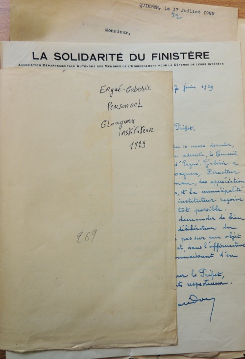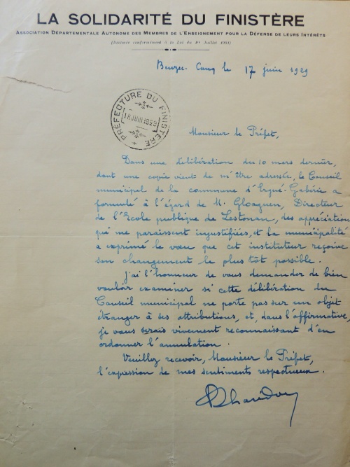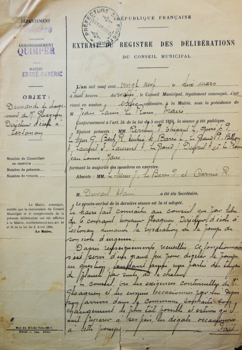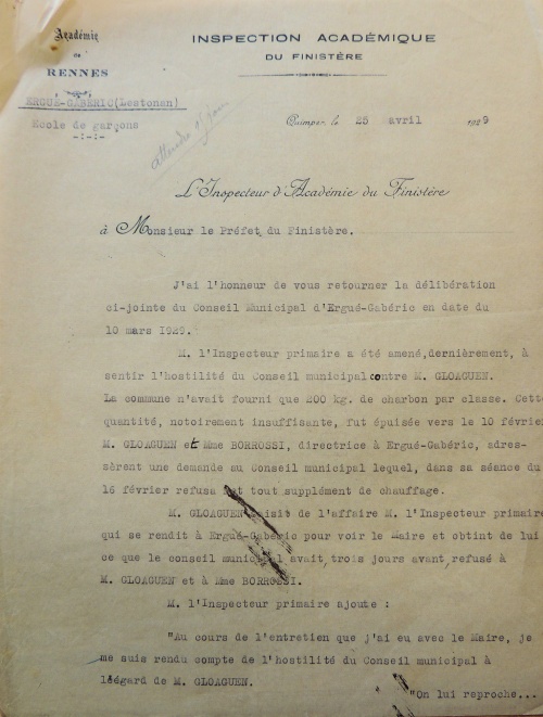 Dans une délibération du 10 mars dernier, dont une copie vient de m'être adressée, le Conseil municipal de la commune d'Ergué-Gabéric a formulé à l'égard de M. Gloaguen, Directeur de l’École publique de Lestonan, des appréciations qui me paraissent injustifiées, et la municipalité a exprimé le vœu que cet instituteur reçoive son changement le plus tôt possible.
