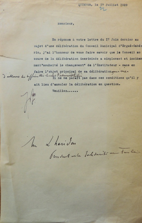En réponse à votre lettre du 17 Juin dernier au sujet d'une délibération du Conseil Municipal d'Ergué-Gabéric, j'ai l'honneur de vous faire savoir que le Conseil au cours de la délibération incriminée a simplement et incidemment "souhaité le changement" de l'Instituteur - sans en faire l'objet principal de sa délibération qui n'est d'ailleurs des difficultés locales d'administration.