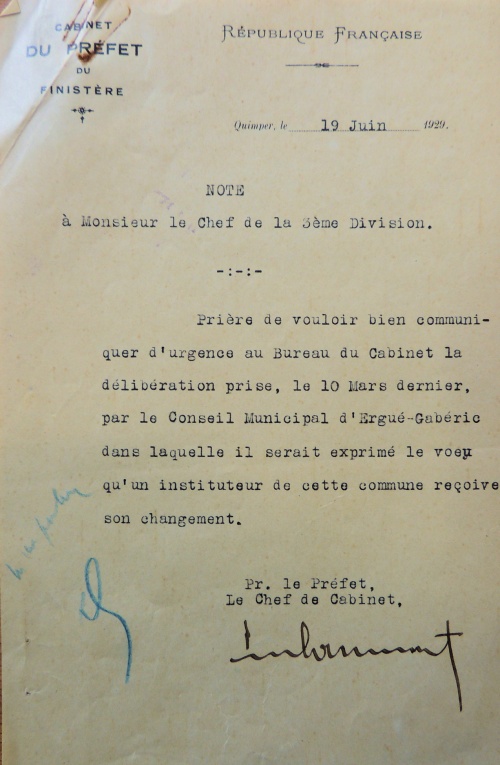Prière de vouloir bien communiquer d'urgence au Bureau du Cabinet la délibération prise, le 10 Mars dernier, par le Conseil Municipal d'Ergué-Gabéric dans laquelle il serait exprimé le vœu qu'un instituteur de cette commune reçoive son changement.