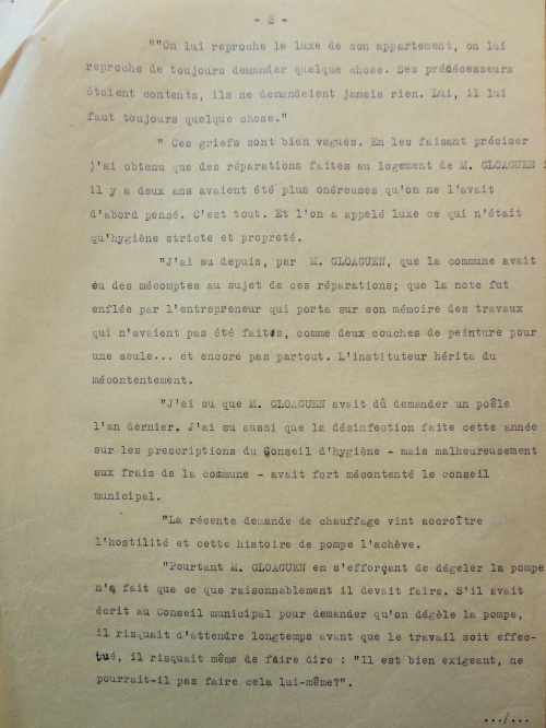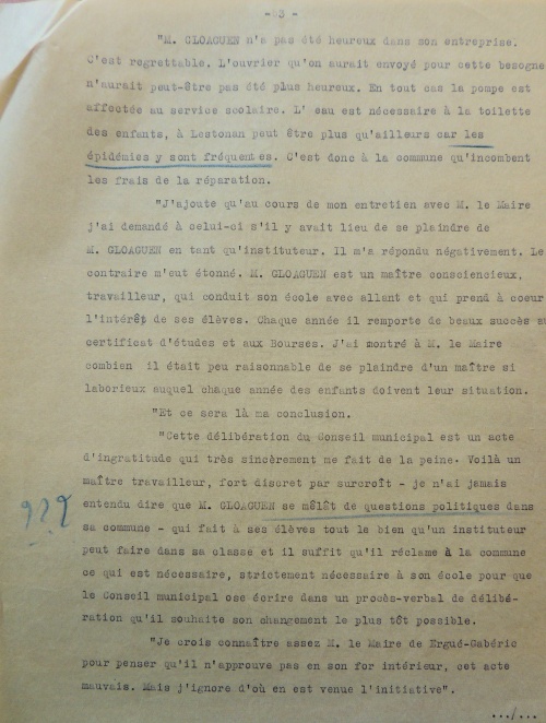 « J'ajoute qu'au cours de mon entretien avec M. le Maire j'ai demandé à celui-ci s'il y avait lieu de se plaindre de M. Gloaguen en tant qu'instituteur. Il m'a répondu négativement. Le contraire m'eut étonné. M. Gloaguen est un maître consciencieux, travailleur, qui conduit son école avec allant et qui prend à cœur l'intérêt de ses élèves. Chaque année il remporte de beaux succès au certificat d'études et aux Bourses. J'ai montré à M. le Maire combien il était peu raisonnable de se plaindre d'un maître si laborieux auquel chaque année des enfants doivent leur situation.