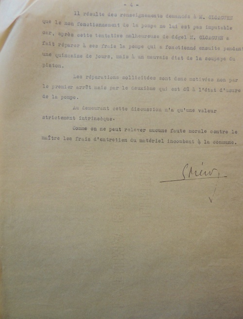 M. Gloaguen n'a pas été heureux dans son entreprise. C'est regrettable. L'ouvrier qu'on aurait envoyé pour cette besogne n'aurait peut-être pas été plus heureux. En tout cas la pompe est affectée au service scolaire. L'eau est nécessaire à la toilette des enfants, à Lestonan peut être plus qu'ailleurs car les épidémies y sont fréquentes. C'est donc à la commune qu'incombent les frais de la réparation. »