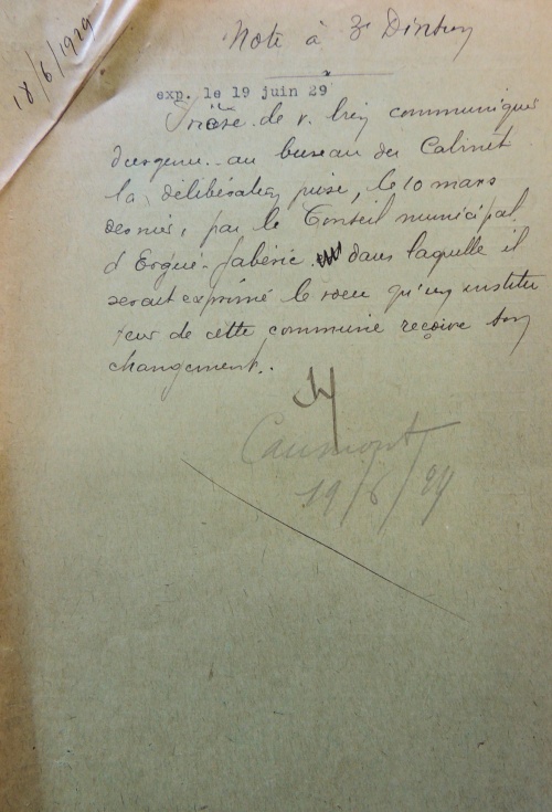 J'ai l'honneur de vous retourner la délibération ci-jointe du conseil municipale d'Ergué-Gabéric en date du 10 mars 1929.
