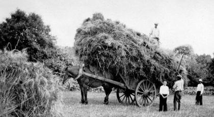 C. Charroi de foin à Kermorvan Une charrette remplie de foin tirée par un seul cheval. | ||