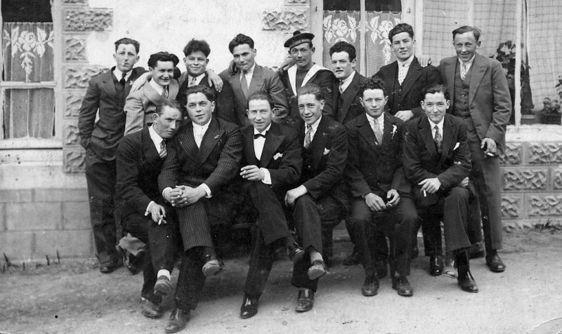 Tous ces jeunes sur la photo ont autour de 20 ans, et sont nés pour la plupart entre 1913 et 1915. Ils sont de sortie sans doute pour le mariage de l'un d'entre eux, vraisemblablement Michel Corre qui porte un noeud-papillon. Si vous avez des infos supplémentaires, notamment si vous reconnaissez l'inconnu aux cheveux bouclés, n'hésitez pas :