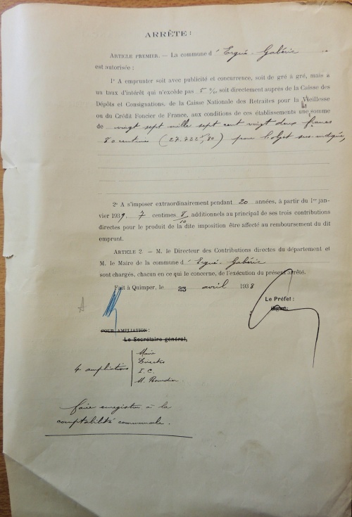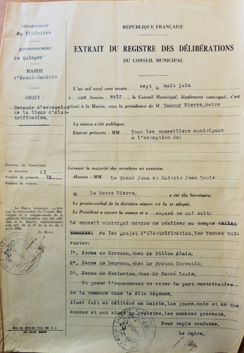 Les documents ci-dessous concernent l'extension du l'acheminement de l'électricité sur la commune, notamment pour desservir 3 fermes isolées (Kervern, Penvern et Kerlavian) à l'est de la commune, et détaillent le coût des opérations pour la commune et de son financement par une hausse d'impôt.