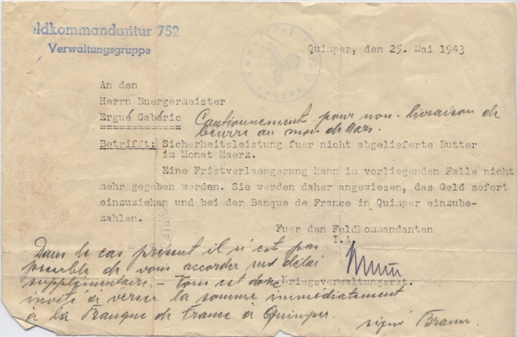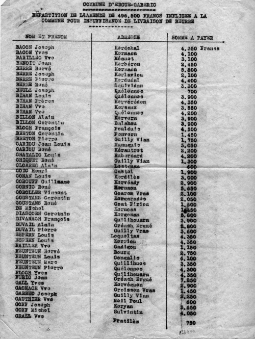 En mai 1943 le maire d'Ergué-Gabéric reçoit un pli de la Kommandantur de Quimper lui enjoignant de payer une amende pour insuffisance de livraison de beurre à l'occupant. Une liste des 165 agriculteurs de la commune est annexée avec pour chacun une contribution monétaire individuelle proportionnelle à la taille de leur exploitation respective. Autres lectures : « 1941 - Demande au préfet d'un délai pour des impayés de fermage à Quillihouarn » ¤ |