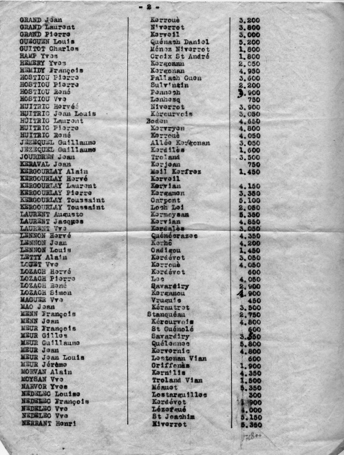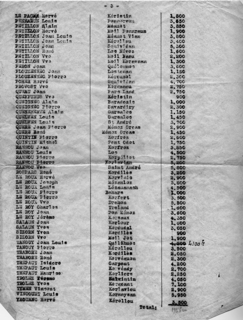 La répartition pour ces chefs de famille, dont la ferme ou village est systématiquement cité, tient vraisemblablement compte des ressources de chaque contributeur, les plus fortes sommes étant attribuées à Yves Trolez de Kergoant pour 7.100 F |