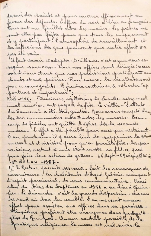 M. le Recteur présente ses vœux, fait les remarques de circonstance. Les habitants d'Ergué-Gabéric manquent d'esprit paroissial, de sens communautaire. Ainsi plus du tiers des baptêmes en 1956 a eu lieu à Quimper. Le dimanche, c'est la grande dispersion : chacun se rend où bon lui semble. L'on ne sent aucun effort pour assister aux offices dans sa paroisse. Plusieurs préfèrent être anonymes dans quelqu'église de Quimper. Aucun contôle possible de la pratique religieuse. La messe est mal suivie. La