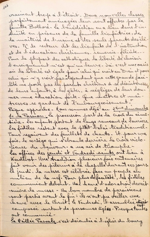 Mois de Marie. Les paroissiens de N.D. de Kerdévot n'ont pas le dévouement, ni la ferveur de leurs ancêtres. Le mois de Marie a peu de succès. Aucun homme n'y vient. Au bourg, les internes de l'école sont là sur commande. À part elles l'on remarque une demi-douzaine de vieilles personnes et, de rares fois, quelques jeunes filles de Poulduic, de la Croix-Rouge, etc ... Dans les chapelles, le résultat n'est guère beaucoup meilleur.