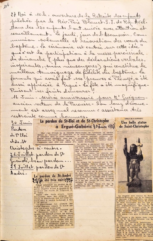 27 Mai à 10h. Ouverture de la Retraite des enfants, prêchée par le Révérend Père Blauet; S. J.de Roz-Avel. Dans les 120 enfants l'ont suivie avec attention et recueillement. Le jeudi, jour de l'Ascension, communion solennelle et rénovation des vœux du baptême. La cérémonie est centrée sur cette idée, que c'est la participation à la messe paroissiale du dimanche (plus que des déclarations verbales, inopérantes, sinon mensongères) qui constitue le meilleur témoignage de fidélité du baptême. La formule qui avait fait ses preuves à Plouyé, a été aussi appréciée à Ergué. La fête a été magnifique. Puisent ses fruits demeurer !