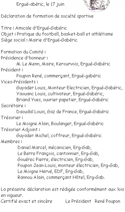 Autres lectures : « 1939 - Dossier d'agrément de la Société "Le Football Club d'Ergué-Gabéric" » ¤ « 1949,1970 - Joueurs de foot à l'USEG (Union Sportive) et à l'AEG (Amicale d'E.-G.) » ¤ « 1956 - Dissolution de l'USEG et création de l'AEG » ¤ « Les korrigans au match de foot AEG-Paotred » ¤ « Ergué contre Gabéric ou les Paotred contre l'AEG, Ouest-France 1986 » ¤