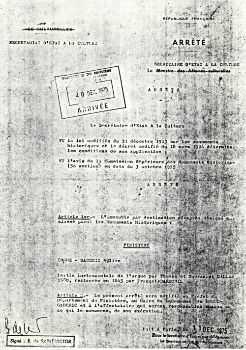 1975-2011 - Arrêtés de classement de l'orgue Dallam d'Ergué-Gabéric