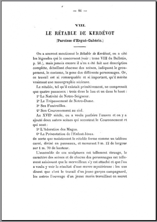 | Cette description du retable de Kerdévot écrite en 1894 reste une référence en la matière.