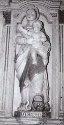 Vierge à l'Enfant debout sur un serpent [1] [2], dans une niche, adossée au deuxième pilier, à droite sous la Crucifixion. Bois polychromie écaillée. Serpent [1] : couché sur le côté, sous le pied gauche de la Vierge. Gueule légèrement ouverte. Yeux rouges. Le corps, vert foncé, est couvert d'écailles sculptées.