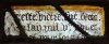 - Sous la 4e lancette de la verrière (panneau d1), une inscription en écriture gothique porte la date millésime de 1516. L'épaisseur du joint en ciment recouvre malheureusement la dernière ligne, laquelle était encore partiellement discernable sur des clichés de 1948 de Louis Grodecki (1910-1982) [6]. Une transcription reconstituée de ces 4 lignes est proposée par Roger Barrié : Ceste.victre.fut.fecte./(en).lan.mil.Vcc.XVI.et./(esto)et.pour.lors.fabric/ue--jeh--al---- [Ref.↑]