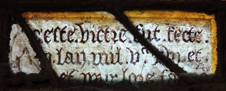 1. Sous la 4e lancette de la verrière (panneau d1), une inscription en écriture gothique porte la date millésime de 1516. L'épaisseur du joint en ciment recouvre malheureusement la dernière ligne, laquelle était encore partiellement discernable sur des clichés de 1948 de Louis Grodecki (1910-1982) [6]. Une transcription reconstituée de ces 4 lignes est proposée par Roger Barrié : Ceste.victre.fut.fecte./(en).lan.mil.Vcc.XVI.et./(esto)et.pour.lors.fabric/ue--jeh--al---- [Ref.↑]