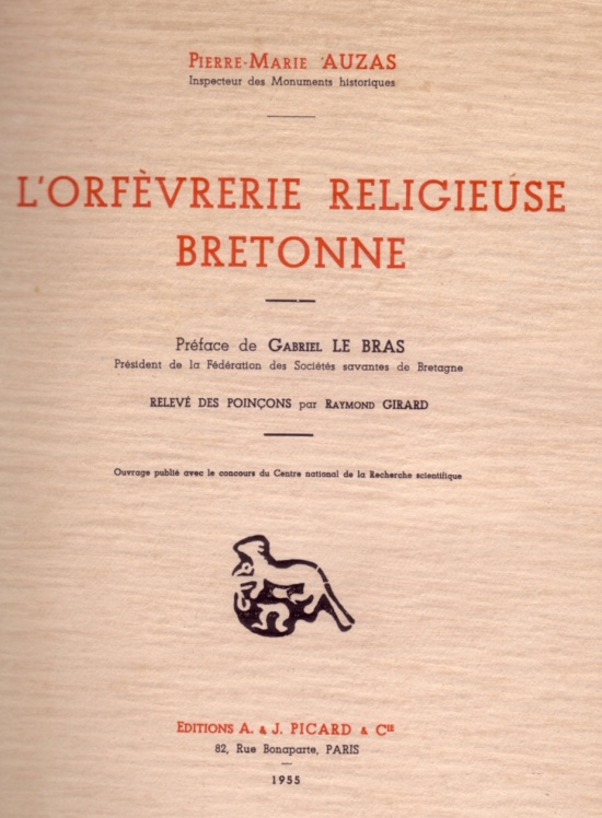 BERNARD Joseph, maître orfèvre Quimper, poinçon insculpé [2] en 1674 : I B couronnés par une hermine héraldique ; demande insculpation [2] Nantes 1701 ; apprenti chez Dupairon, à Landerneau, 1660 (six ans), puis à Paris et autres villes ; répare châsse de saint Ronan, cathédrale de Quimper 1670 ; exécute une croix, un encensoir, une navette pour Pont Croix 1673, six chandeliers d'argent à pied, une boite aux saintes huiles, une coquille d'argent en 1677-1678 pour la même église, la nouvelle châsse de saint Ronan pour la cathédrale de Quimper en 1687 ; répare croix de Locronan 1694-1695. Poinçon biffé à sa mort en 1701 donne : une fleur de lys surmontée d'une couronne royale, une hermine cantonnée des initiales I B et en pointe un mouton (sans doute pour gos ouvrages) (3,6,9). Œuvres probables à Ergué-Gabéric, Le Juch, Locronan, Pleuven, Pont Croix, Pouldreuzic (F.).