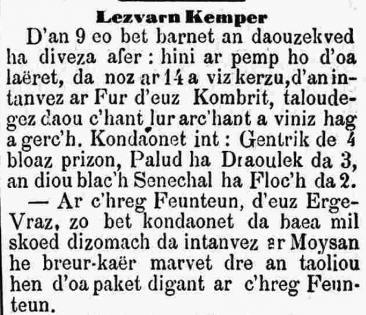 Le procès en cour d'assises au palais de justice de Quimper ouvert le 31 janvier 1888 a donné lieu à des comptes rendus dans trois journaux locaux : « Le Courrier du Finistère » Le premier d'entre eux le fait via un entrefilet en langue bretonne en première page : « Ar c'hreg Feunteun, d'euz Erge-Vraz, zo bet kondaonet da baoa mil skoed dizomach da intanvez ar Moysan he breur-Kaër marvet dre an taoliou hen d'oa paket digant ar c'hreg Feunteun. » (La femme Feunteun, d'Ergué-Gabéric, a été condamnée à payer mille écus pour dédommager la veuve de Moysan, son beau-frère mort sous les coups donnés par la femme Feunteun.) Cet article, qui ne dit pas que l'inculpée a été acquittée en correctionnelle, signale une condamnation au civil pour une somme de « mil skoed »[5]. Cela équivaut à 5.000 francs, car l'unité monétaire populaire de l'écu valait 100 sous (« gwenneg » [6] en breton), soit 5 francs.